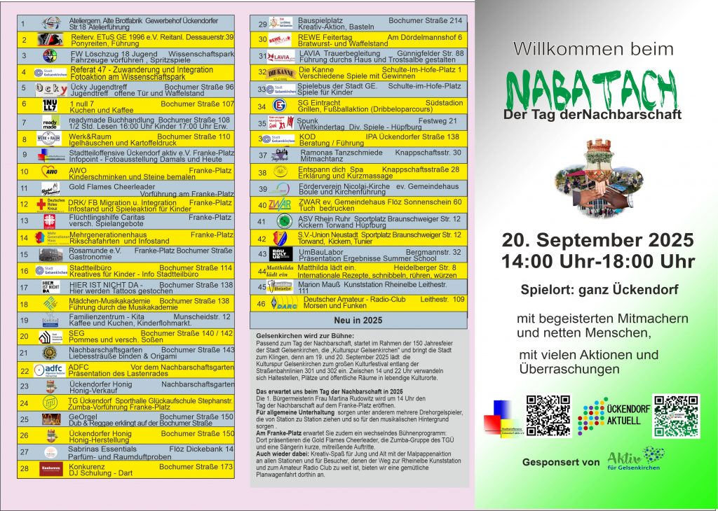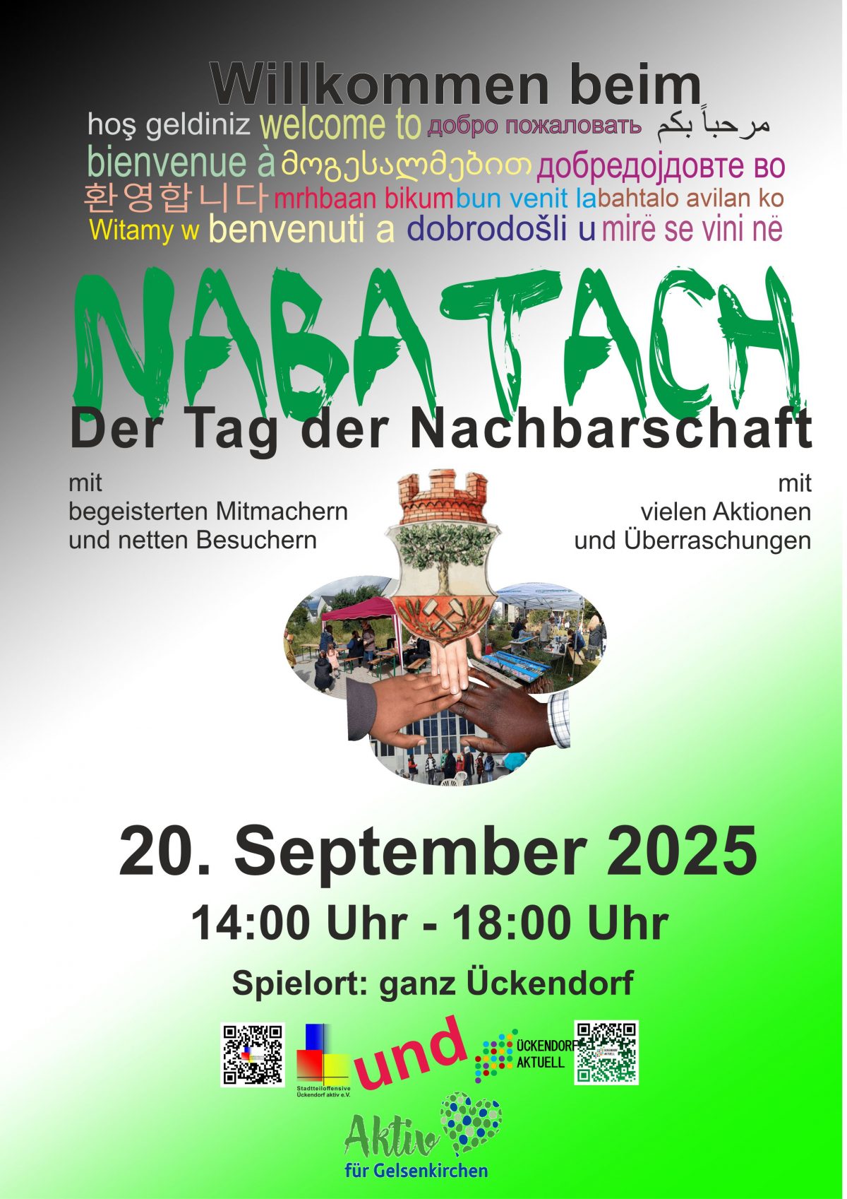 Am 20. September lud die „Stadtteiloffensive Ückendorf aktiv“ wieder zum beliebten „NaBaTach – Tag der Nachbarschaft“ ein. Zahlreiche Besucherinnen und Besucher nutzten die Gelegenheit, gemeinsam zu feiern, neue Kontakte zu knüpfen und die vielfältigen Angebote der teilnehmenden Vereine und Institutionen kennenzulernen.