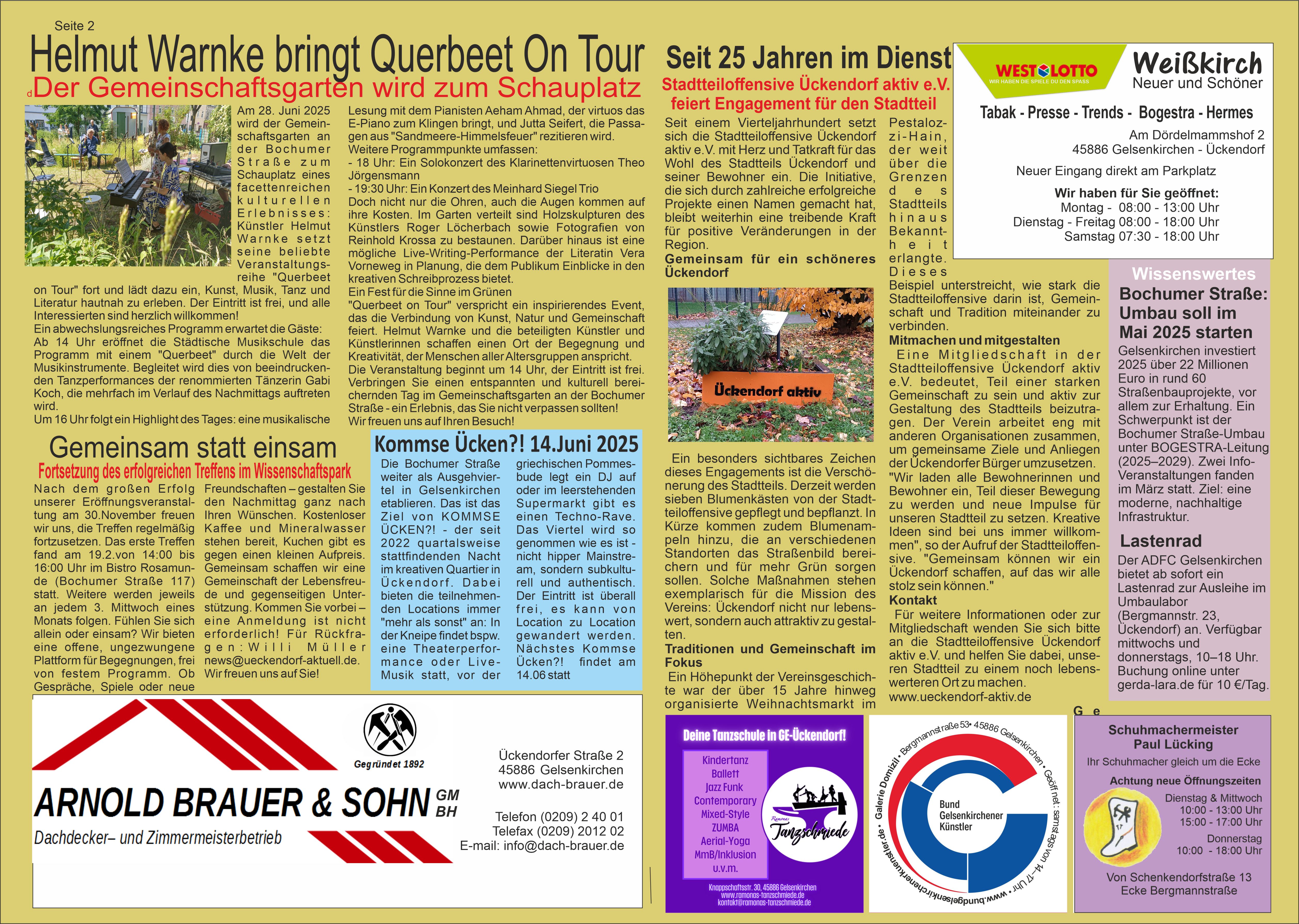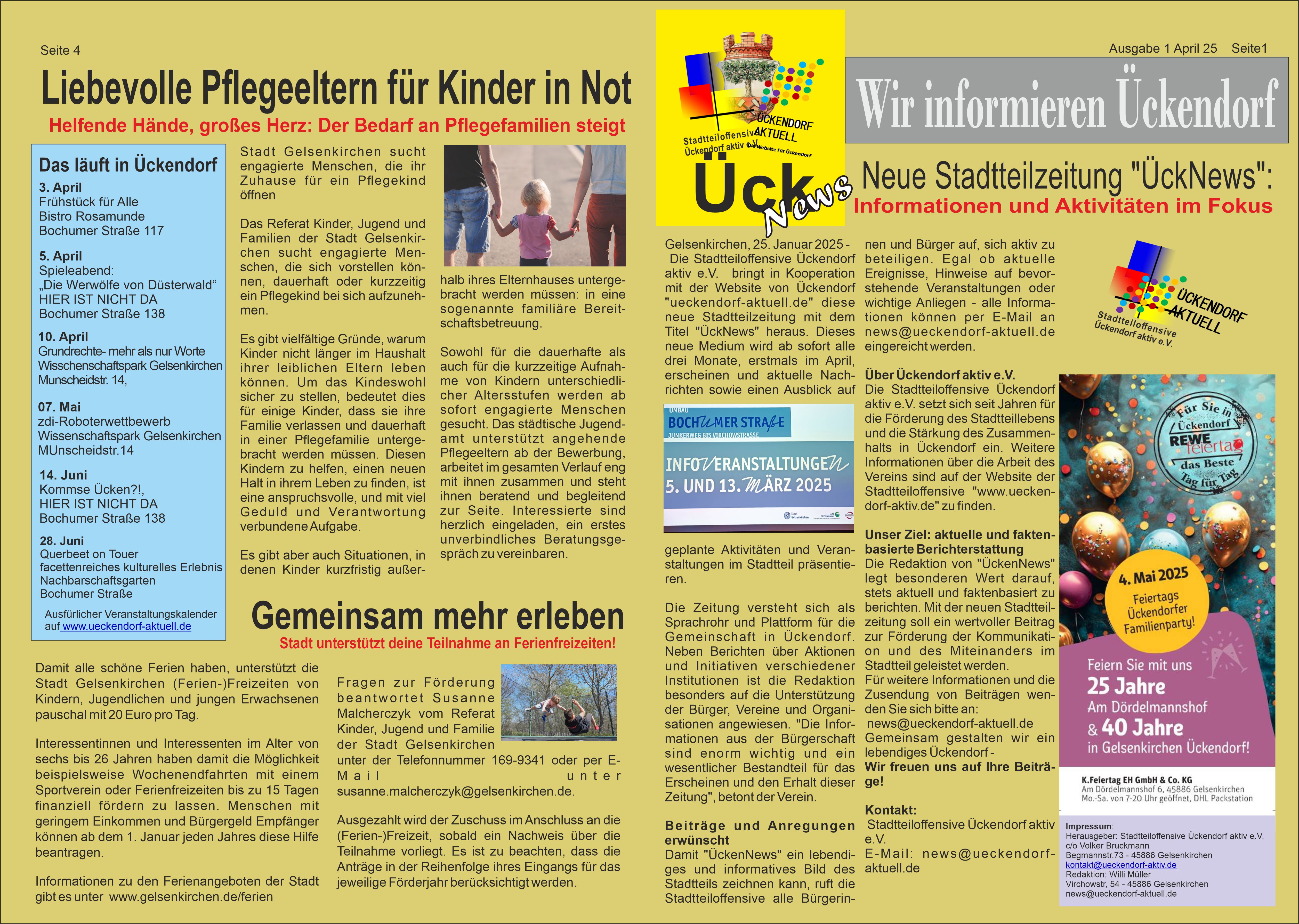 Falls ihr noch kein Exemplar bekommen habt, findet ihr weitere Ausgaben an ausgewählten Auslagestellen – solange der Vorrat reicht. Mit Ück News schaffen wir ein lebendiges Sprachrohr für den Stadtteil. Wir berichten über Aktuelles, Wichtiges und Bewegendes in Ückendorf – von lokalen Initiativen und Veranstaltungen bis hin zu Projekten, Mitmachaktionen und Terminen verschiedenster Einrichtungen. Unser Ziel ist es, Aktivitäten sichtbar zu machen, zur Beteiligung einzuladen und das Gemeinschaftsgefühl weiter zu stärken.